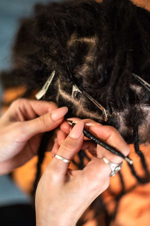 braiding dreadlocks by a master hairdresser. close up.