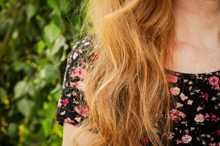 Shoulders shot of red haired lady in summer dress, joyful summertime