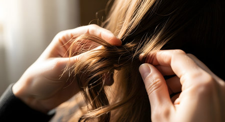 A close-up view of hands gently braiding or styling long, brown hair, capturing the texture and shine of the strands. The image highlights personal grooming, beauty routines, and hair care.