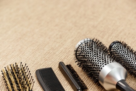 Combs and hairdresser tools on beige background