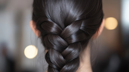 A close-up view of a beautifully braided dark hairstyle, showcasing smooth texture and elegance. Soft lighting enhances the aesthetics and highlights the intricate details of the braid.