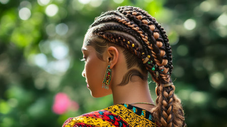 A woman with a trendy braid hairstyle featuring intricate patterns and embellishments, set in a vibrant, outdoor environment to showcase the hairstyledetail and creativity.