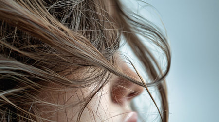 Close-up view of a womans ear with her hair gently swaying in the wind, showcasing hair care and stylish look.