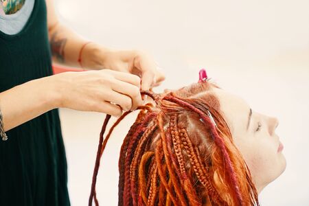 Barber braids safe dreadlocks. American hairdresser made plaits in African style for young Caucasian girl. kanekalon