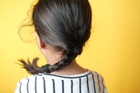 child girl with long hair against yellow background ,