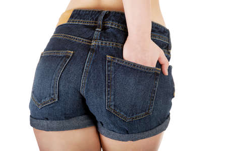 Sexy woman buttocks in denim shorts, free space. Perfect female ass in jeans briefs, white background, copy space for text or advertisement