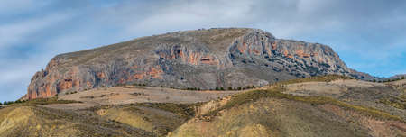 View on far Chest Butte or Onlo mountain against cloudy evening sky. Mountain range Sunduki is a natural and historical monument in Republic of Khakassia, Russia. Travel in Russia concept