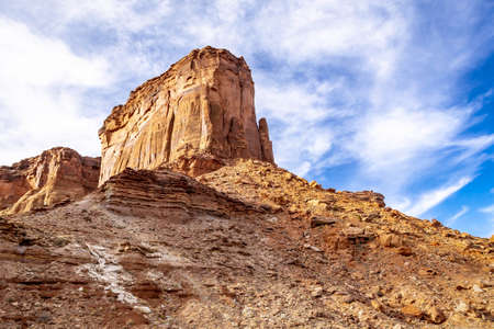 Looking up at a butte with wispy white clouds and a brilliant blue sky in Canyonlands National Park.