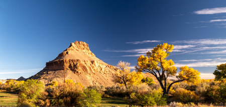 colorful pink butte yellow conttonwood trees mountains autumn Canyonlands National Park Needles District Utah