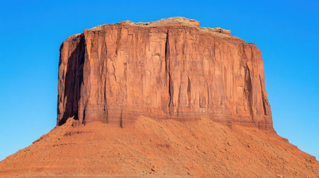 Close-up of a towering butte in Monument Valley, showcasing the rugged red sandstone formations and intricate textures against a clear blue sky in the Arizona-Utah desert.