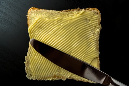 Butter with beautiful stains and a knife on a piece of bread close-up isolated on a black background
