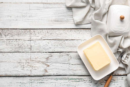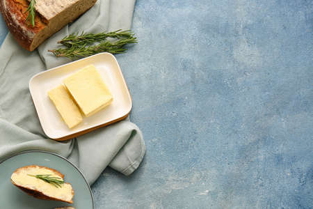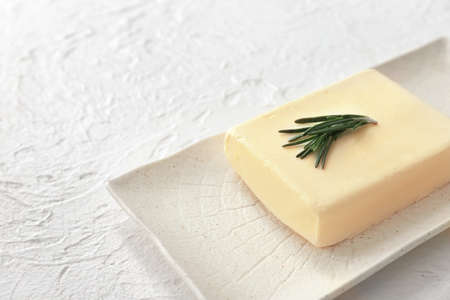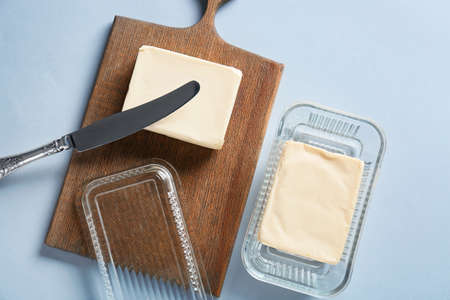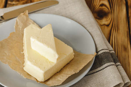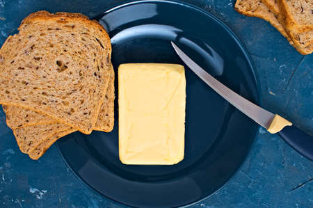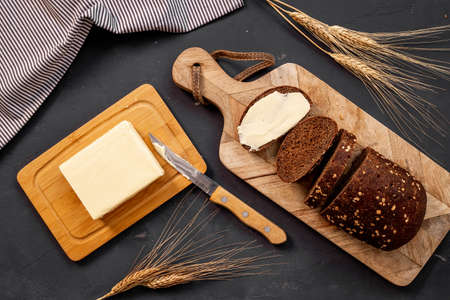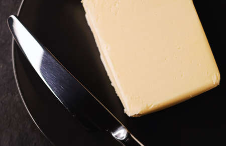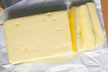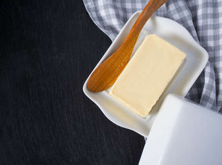 Cut block of butter on the kitchen table. Close-up view, gray stone background.