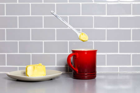 A floating teaspoon of butter with a red coffee mug to make bulletproof coffee.