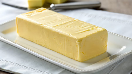 A block of creamy yellow butter rests on a clean surface, showcasing its rich texture. Perfect for culinary uses, it embodies the essence of quality cooking ingredients.