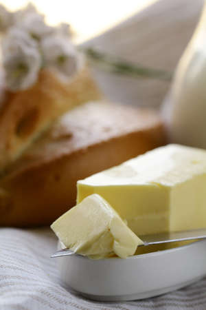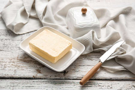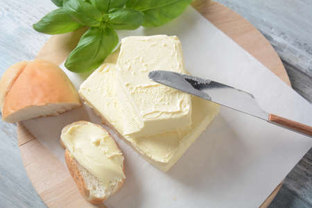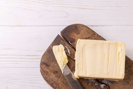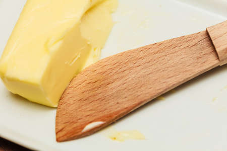 Kitchen, food objects concept. Detailed closeup of butter with wooden spatula knife