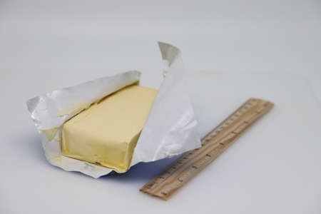A piece of butter in a package on a white background, proper nutrition, calorie counting