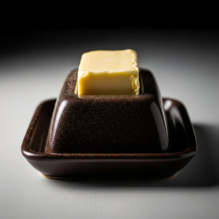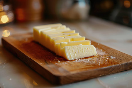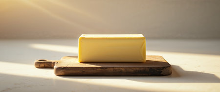 A yellow block of butter placed atop a wooden cutting board. AI-generated.