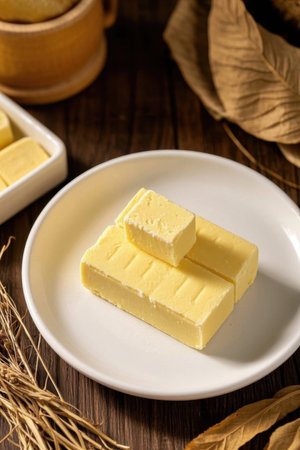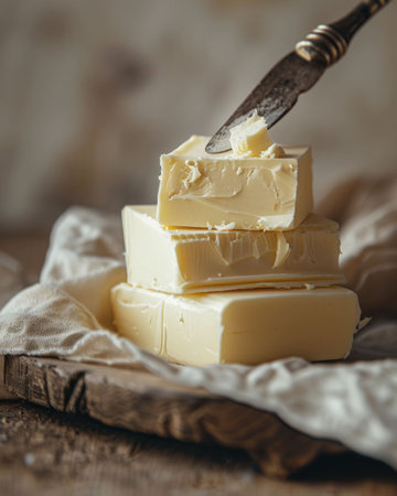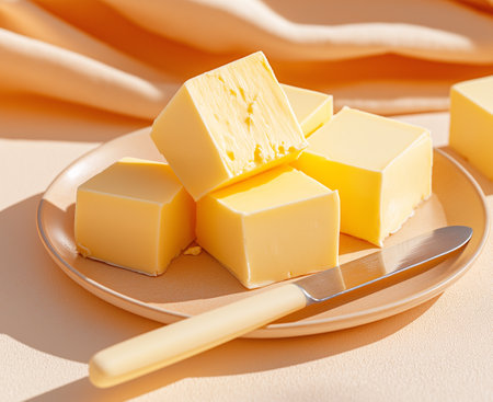 A Creamy butter blocks on plate with knife, showcasing warm, inviting scene. soft yellow color and smooth texture create delightful culinary atmosphere
