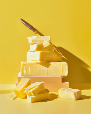 Butter blocks stacked on a yellow background with a knife, showcasing a minimalist food composition ideal for culinary themes, cooking, and dairy products