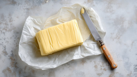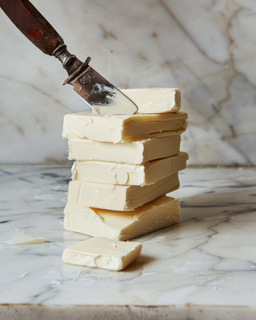Butter sticks stacked on a marble surface with a knife inserted, showcasing a minimalist kitchen concept The soft yellow color of the butter contrasts with the grayish marble background