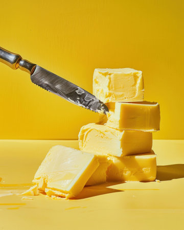 Butter blocks stacked on a bright yellow background with a butter knife spreading butter on top The vibrant color emphasizes the creamy texture and freshness of the butter