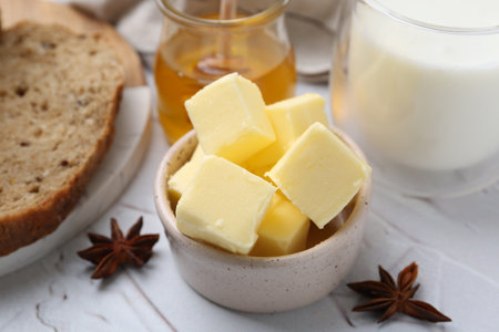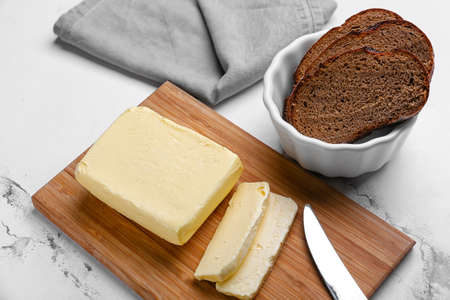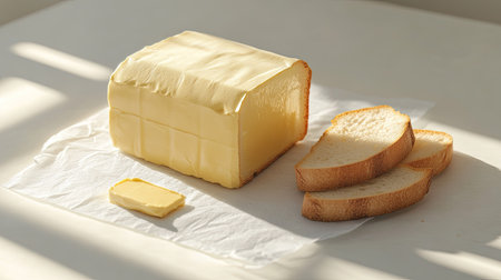 A block of creamy butter rests on a piece of bakery paper beside two slices of fresh bread. The soft golden hue enhances the inviting kitchen scene.