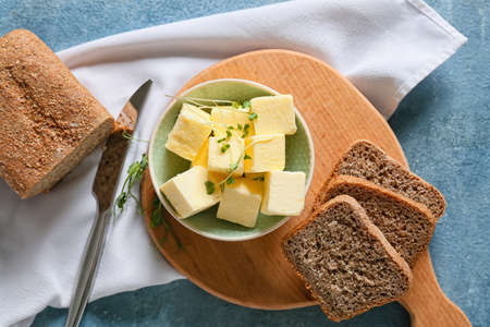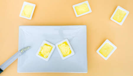 Butter diced with yellow knife, minimal butter concept, view from above, space for a text