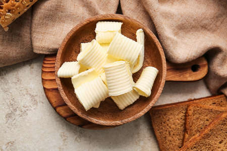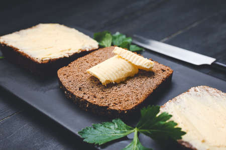 Toasted bread with fresh butter curls. margarine or spread, fatty natural dairy product on breakfast sliced bread