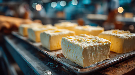 Fresh butter blocks neatly arranged on a production line showcase the beauty of dairy processing. Capture the essence of food manufacturing in a modern kitchen environment.