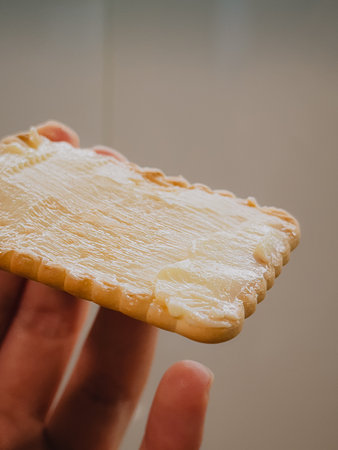 Hand holding single cracker topped with creamy butter, creating deliciously satisfying snack option perfect for any time of day, from breakfast to quick treat. Hand holding cracker spread with butter