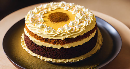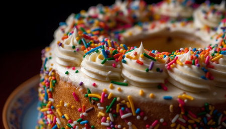 Deliciously decorated cake topped with swirls of cream and colorful sprinkles showcases baking artistry and sweet indulgence