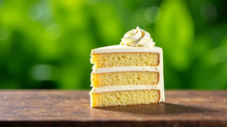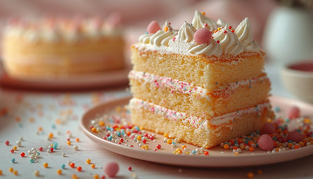 AI Generated. Delicious Slice of Vanilla Butter Cake with White Frosting and Sprinkles