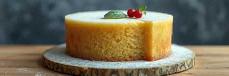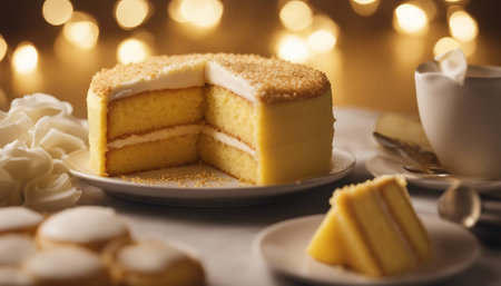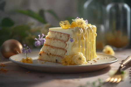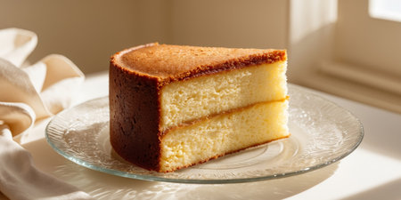 AI Generated. A slice of rich butter cake resting on an elegant glass plate surrounded by a warm ambiance