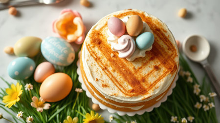 Festive spring dessert featuring a layered cake topped with colorful eggs and decorative flowers for a cheerful celebration