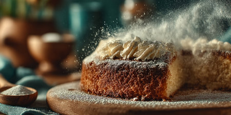 Powdered sugar drifting in soft motion over a cake in a dreamy kitchen. Generative AI