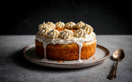 Delicious layered cake with cream frosting and decorative meringue on a dark background during a dessert preparation
