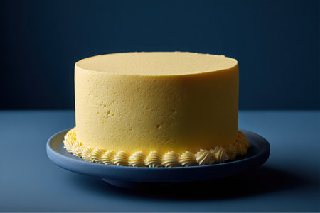 A smooth yellow frosted cake rests on a blue cake stand. The cake is decorated with simple yellow swirls of frosting around the base. The background is a dark blue color.