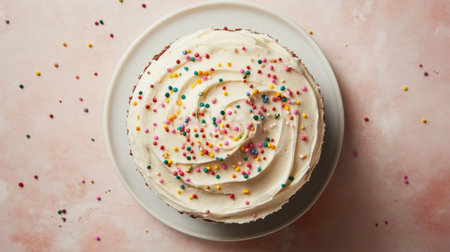 Detailed shot from above of a classic vanilla cake with a smooth frosting and a sprinkle of colorful confetti, highlighting its simple yet elegant decoration.