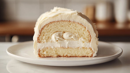 A close-up of a fluffy sponge cake roll filled with creamy vanilla frosting, placed on a white ceramic plate.