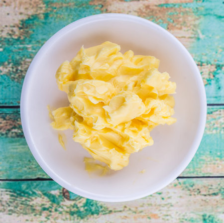 Top view of a bowl of fresh butter placed delicately on a gray linen cloth