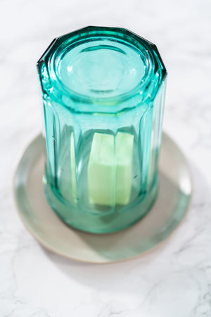 Unsalted butter sticks cut into cubes for preparing Italian buttercream frosting.