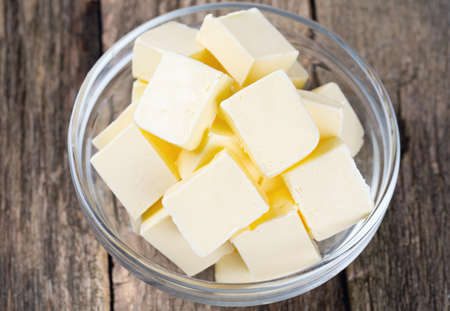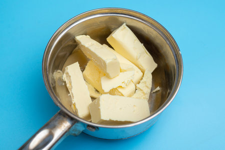 Chopped pieces of butter milk butter in a saucepan on a blue background. Preparing for melting.