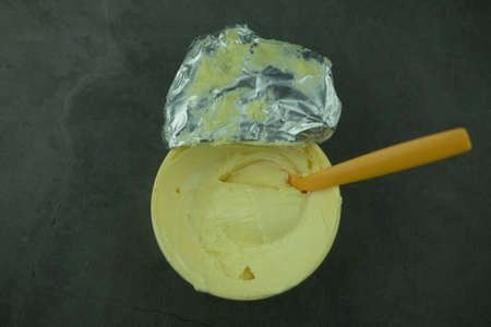 Soft butter with yellow spoon in yellow plastic container cup with aluminum foil lid on black background