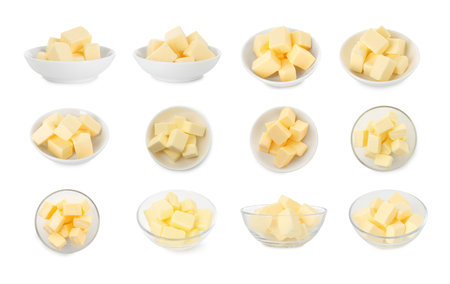 Set with pieces of butter in bowls isolated on white, views from different sides