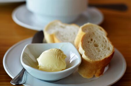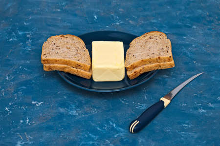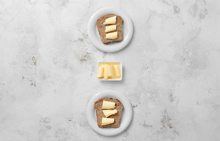 Bread with butter, set for a short breakfast. Simple rustic vegetarian food concept. Flat lay top view Stock photo.