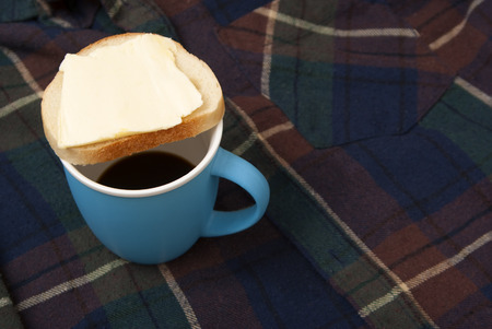 Sandwich on a blue cup from coffee against the background of a klechaty shirt