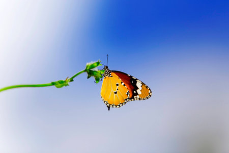 Beautiful macro of morning butterfly on sitting on plant on green meadow.