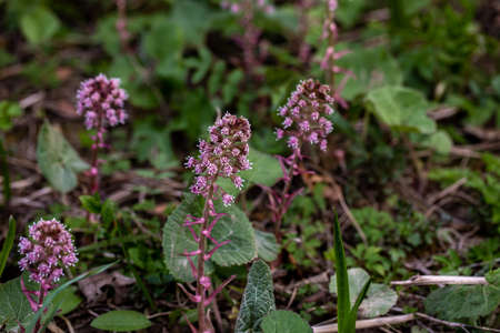 Pink butterbur flower on the forest floor. Macro photo.