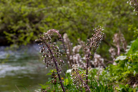 Inflorescences of butterbur, pestilence wort, Petasites hybridus.Blossom, Common butterbur. A blooming butterbur Petasites hybridus flower in the meadow.