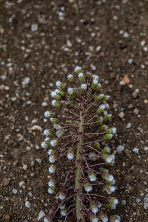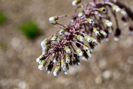 Petasites albus springtime forest herb, perennial rhizomatous plant flowering with group of small white flowers, starting to bloom